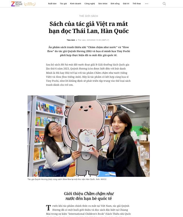 Trước ngày ra mắt cuốn sách “Chầm chậm như nước” – “Slow flow” tại Hà Nội, mời bạn đọc bài báo về hành trình của cuốn sách tại một số quốc gia khác được Zingnews đưa tin nha. Slowbooks và toàn bộ đội ngũ thuộc dạng “làm nhiều nhưng ít khi biết kể”. Tụi mình vẫn đang nỗ lực kể nhiều hơn cho các bạn về những điều chúng mình làm. Nhưng mà vẫn…chậm.