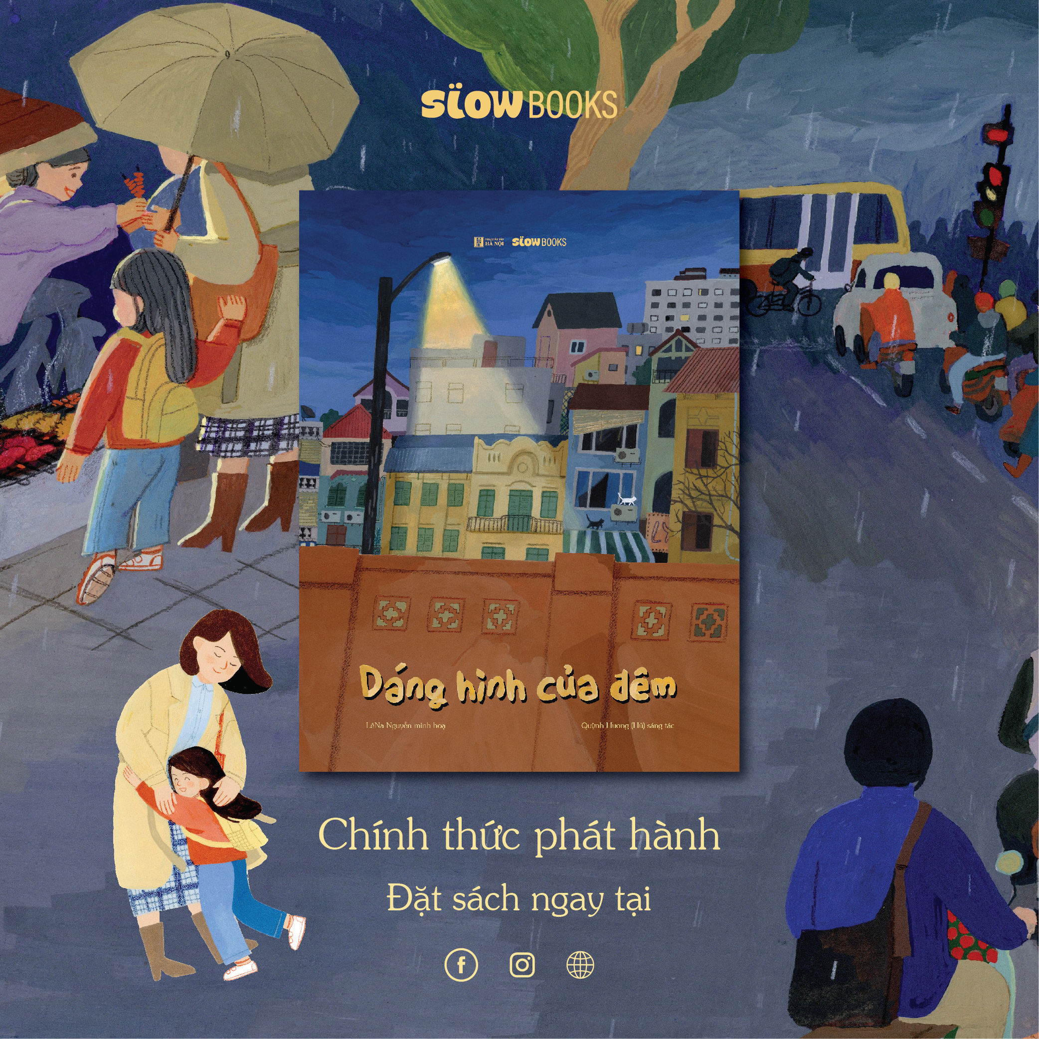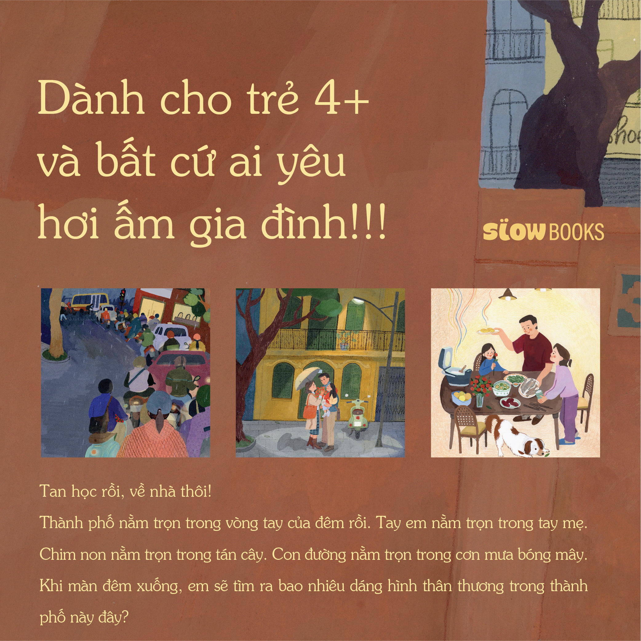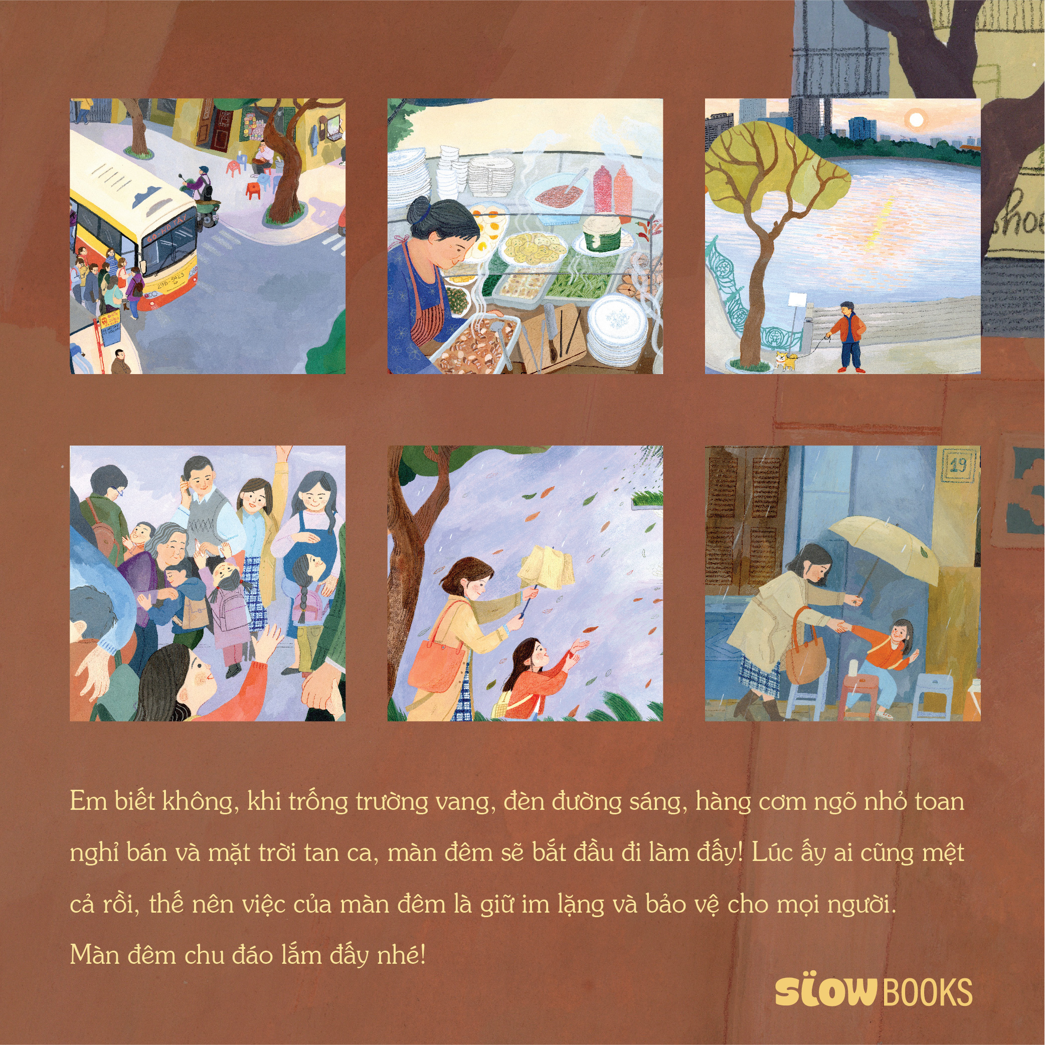 Cuốn sách lấy bối cảnh thành phố Hà Nội vào những ngày cuối năm khi những cơn gió lạnh và mưa lâm râm kéo đến. Câu chuyện bắt đầu khi tiếng trống của ngôi trường mà em bé gái nhân vật chính đang theo học vang lên. Tan học, tan làm, tan ca, ai ai trong thành phố cũng bắt đầu nghỉ ngơi. Thế mà có một nhân vật mới bắt đầu đi làm, đó chính là…màn đêm! À, mà có phải chỉ có màn đêm không nhỉ? Trong đêm, liệu bé sẽ phát hiện thêm những dáng hình thân thương nào?